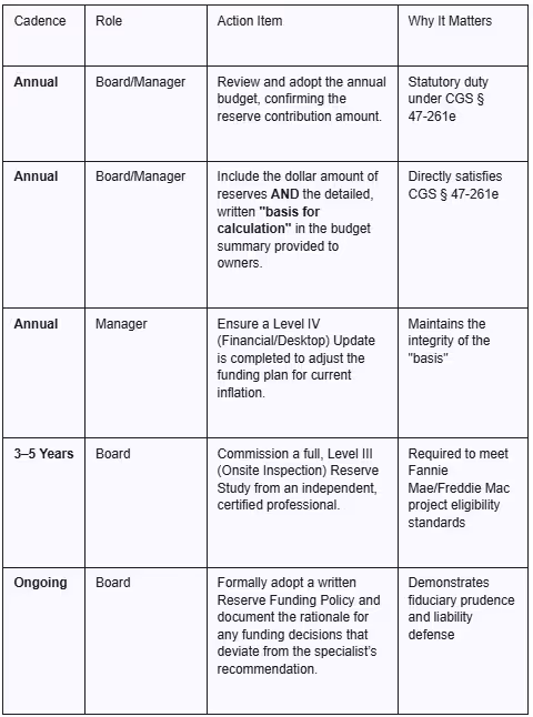 For Connecticut HOA and COA boards and property managers, here are the essential action items to ensure compliance with CIOA and market standards: